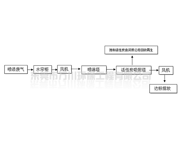 根據廠方提供的資料及現場勘察的情況。其噴漆廢氣的來源主要為無塵噴漆車間內的5條自動噴涂線。在生產過程中有噴漆,該工序產生了一定量含三苯有機廢氣和噴漆粉塵,該廢氣不僅對環境造成污染,而且對人體有較大的危害作用,同時也破壞了周邊的環境,造成了不良的影響,需進行處理后排放。我們工程師分析了該廢氣的特點和以往的案例經驗,采用了“水簾柜+噴淋塔+活性炭吸附塔”這套解決方案,