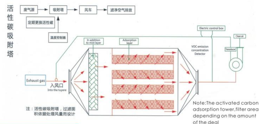 4.塔體設計交流錯位過風,過風面積大,阻力較小,采用抽屜式設計,更換活性炭非常方便,且流速均勻,吸附效率高。